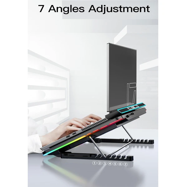 طراحی فوق العاده سال 2021 که توسط شرکت کول کلد طراحی گردیده و با قدرت خنک کنندگی 6 فن با دور 2600±10%RPM و رنگ آمیزی فوق العاده زیبا به همراه LED های رنگی که در کناره های کول فن جای گرفته و همچنین پایه نگهدارنده گوشی موبایل ، باعث شده تا زیباترین و خاص ترین محصول 2021 را به ارمغان بیاورد. جنس بنده از پلاستیک با کیفیت ABS و فلز می باشد این کول پد دارای 2 دکمه اسکرولی جهت کم و زیاد کردن سرعت فن ها و همچنین خاموش و روشن کردن تعداد فن ها و یک دکمه جهت تغییر رنگ نور LED ها می باشد که دارای 10 حالت نورانی می باشد و پایه قابل تنظیم در زیر کول پد و همچنین یک پایه در وسط و روی کول پد جهت ثابت نگه دارنده لپ تاپ در حالت شیبدار می باشد. این کول پد مناسب گیمرها ، طراحان گرافیک و معماری و … می باشد .