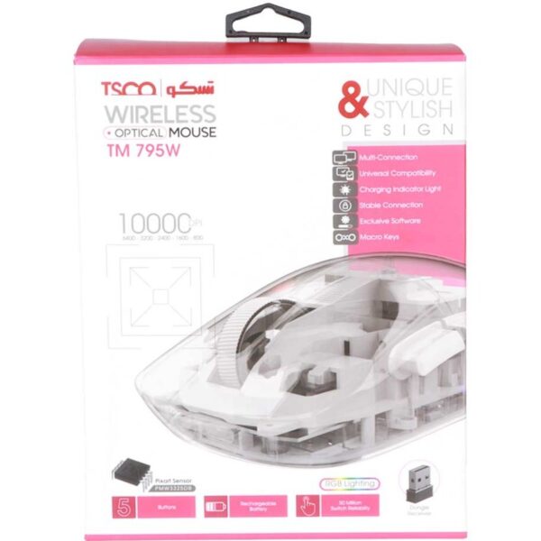 از طرفی، نور پردازی RGB هم در خدمت سبک شخصی شما قرار گرفته و حس گیمینگ و مدرن بودن را به فضای کاری یا گیمینگ اضافه میکند. TM 795 W به یک سنسور اپتیکال با دقت قابل تنظیم از 800 تا 10000 DPI مجهز شده که به شما اجازه می دهد تا سرعت و حساسیت موس را به صورت لحظه ای تغییر دهید. بازه ی وسیع DPI و کلید اختصاصی برای تغییر آن، باعث شده این مدل برای کارهای گرافیکی دقیق، طراحی، بازی های سریع و حتی استفاده های عمومی کاملاً انعطاف پذیر باشد. تمامی کلید های این موس برای تحمل ۵۰ میلیون بار کلیک طراحی شدهاند. در دل این موس، یک باتری ۵۰۰ میلی آمپر ساعتی قرار دارد که تا ۶۰ ساعت استفاده بی وقفه را تنها با یک بار شارژ فراهم می کند.