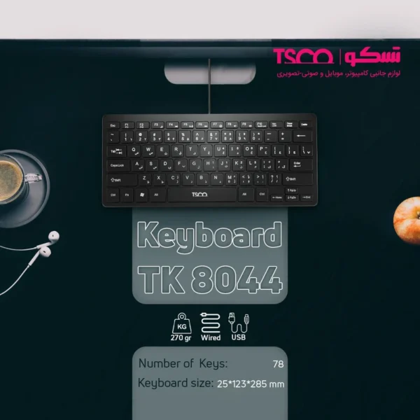 این کیبورد با سیم، با استفاده از درگاه USB، اتصالی پایدار و بدون تأخیر را ارائه می دهد و با طراحی ساده و عملکردی روان، کیبورد تسکو مدل TK 8044 نه تنها به عنوان یک ابزار کارآمد، بلکه به عنوان یک همراه مطمئن در انجام وظایف روزمره شما ایفای نقش می کند. کیبورد تسکو مدل TK 8044 دارای 78 کلید اصلی است که با استفاده از سوئیچ های ممبران (Membrane Switch) طراحی شدهاند. وجود نشانگر های LED کوچک برای وضعیت Num Lock و Caps Lock نیز به بهبود تجربه کاربری کمک می کند و اطلاعات ضروری را به صورت واضح و کاربردی نمایش می دهد. این طراحی بدون پیچیدگی، علاوه بر حفظ ظاهری شیک و حرفه ای، مصرف انرژی را کاهش داده و تمرکز کاربر را روی وظایف اصلی حفظ می کند. این کیبورد از طریق یک کابل 1.8 متری با درگاه USB به سیستم متصل می شود.